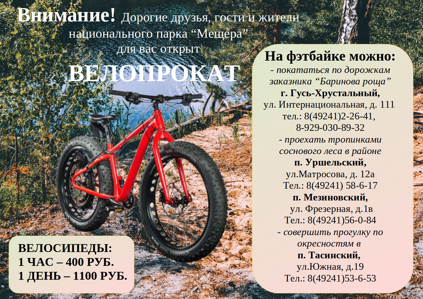 пребывания на территории национального парка «Мещера»Пребывание на территории парка, за исключением дорог общего пользования (между населенными пунктами) предполагает приобретение разрешительного платного документа. Произвести оплату можно по реквизитам парка, указанным на сайте www.park-meshera.ru. Для приобретения разрешительного документа вы можете отправить скан оплаты на e-mail meshera.turizm@mail.ru и получить на вашу почту разрешительный документ с телефонами дежурных инспекторов.