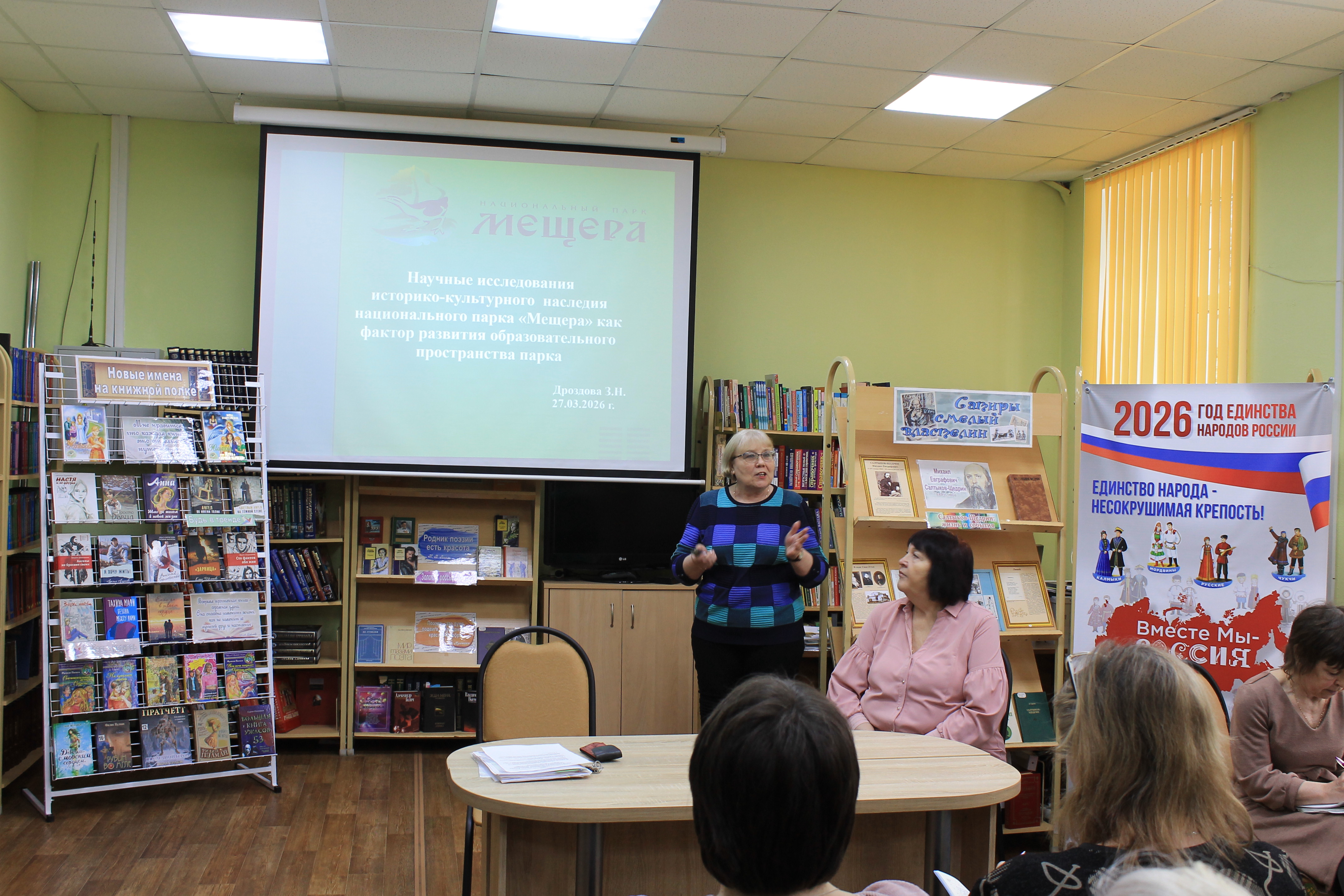 Совещание началось с выступления заместителя директора по научной работе национального парка «Мещера» Дроздовой З.Н. В своем докладе-презентации она рассказала про «Историко-культурное наследие национального парка «Мещера». Участники совещания проявили большой интерес к теме доклада. После выступления было задано много вопросов.