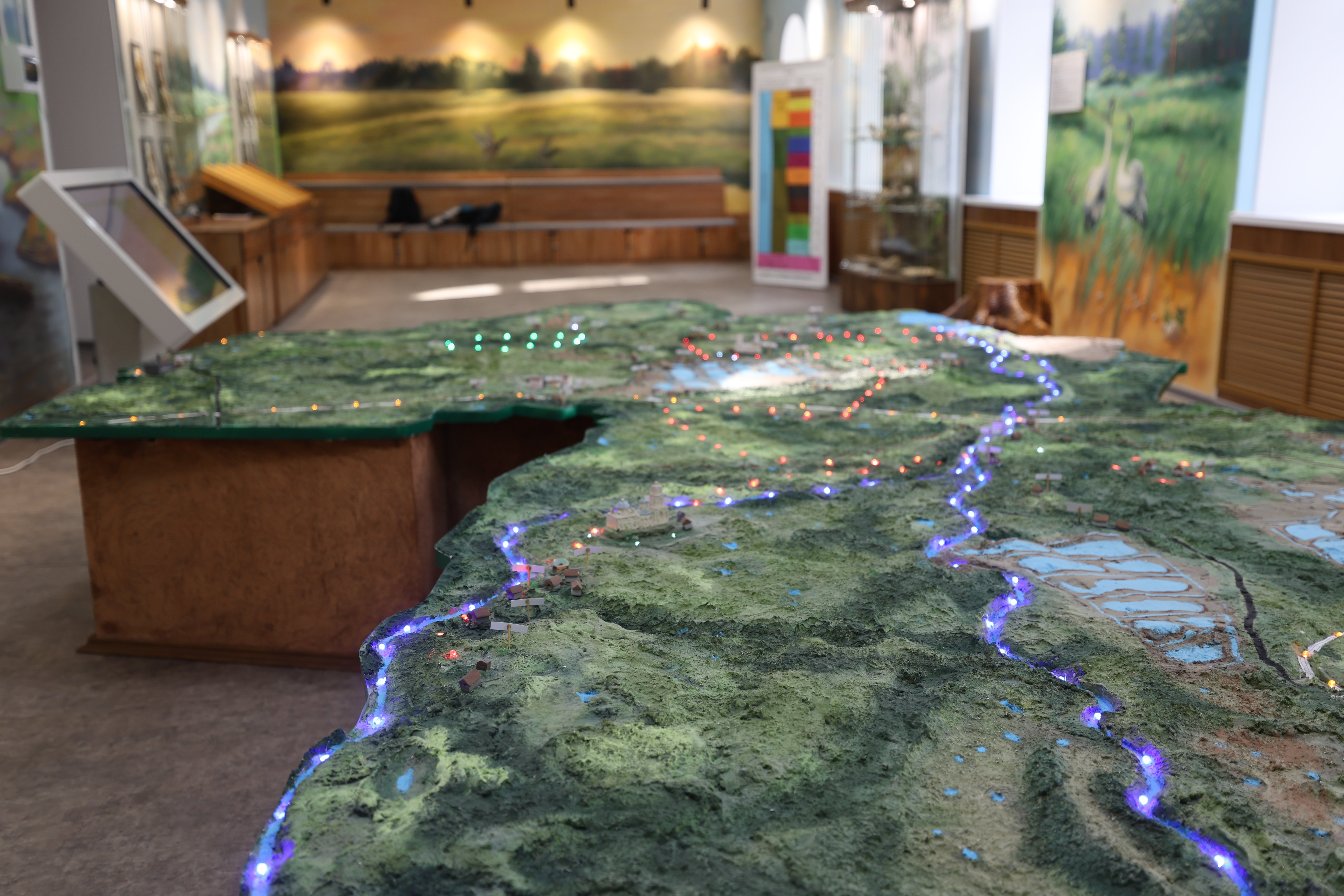 Учащимся была проведена экскурсия по макету территории национального парка «Мещера». Впечатлила юных посетителей визит-центра подсветка каждого объекта на макете. И конечно же, никого из детей не оставили равнодушным коллекции бабочек и жуков.